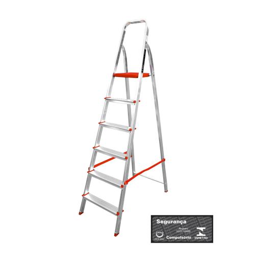 Escada leve e resistente em alumínio, com 6 degraus antiderrapantes, ideal para trabalhos em alturas maiores com segurança e estabilidade. Dobrável e fácil de transportar, atende uso doméstico e profissional.