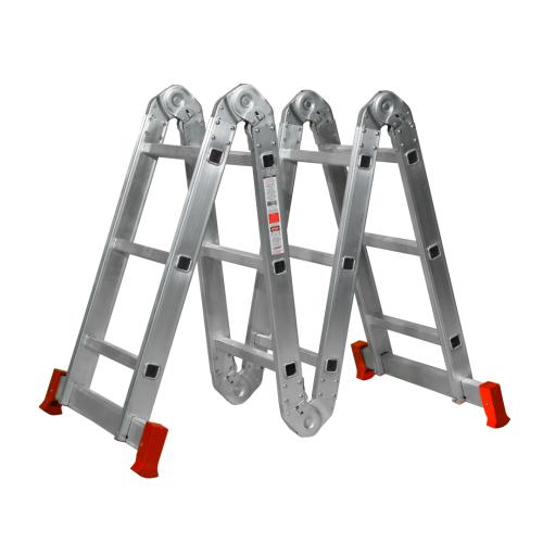 Escada articulada em alumínio com configuração 3x4 degraus, versátil e multifuncional. Pode ser usada como escada reta, escada em “L”, proporcionando segurança e praticidade para diversas aplicações profissionais e domésticas.