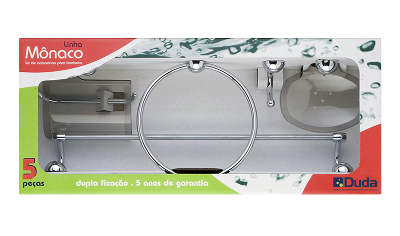Kit para banheiro com 5 peças. Detalhe em formato esfera. Possui dupla fixação. Saboneteira e protetor de papeleira em resina técnica, muito mais resistência.