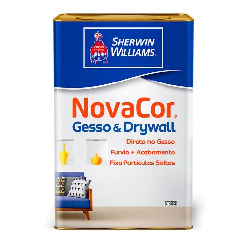 Novacor Gesso & Drywall é uma tinta à base de emulsão acrílica desenvolvida especialmente para aplicação direta sobre gesso e drywall (gesso acartonado), proporcionando efeito decorativo e de proteção à superfície. Também pode ser aplicado em superfícies internas de reboco e massa corrida. Possui ótima aderência e poder de penetração. Economiza tempo e mão-de-obra pois atua como fundo e acabamento, fixando partículas soltas e secando rapidamente.